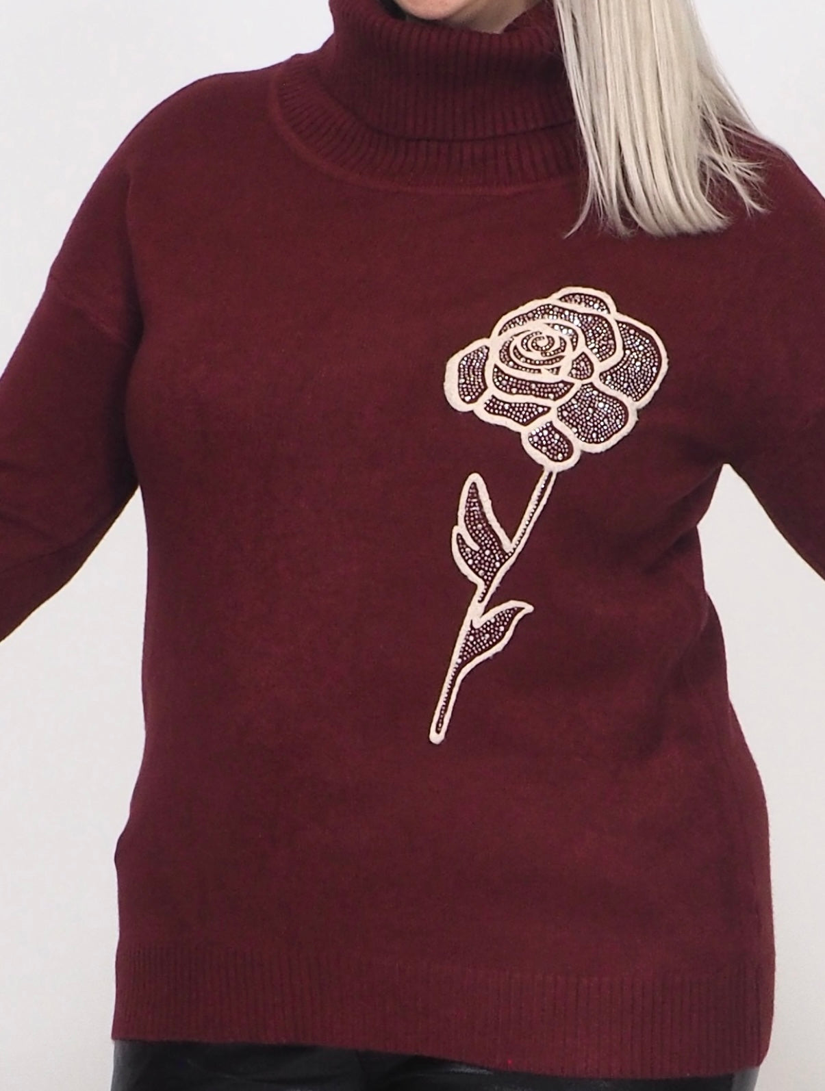 • Korkeakauluksinen neulepusero jossa kaunis kukkakoriste blingeillä