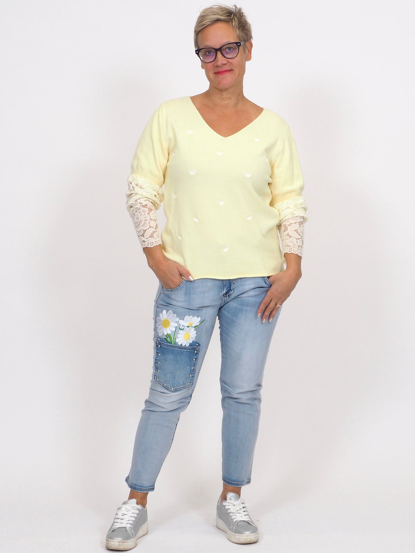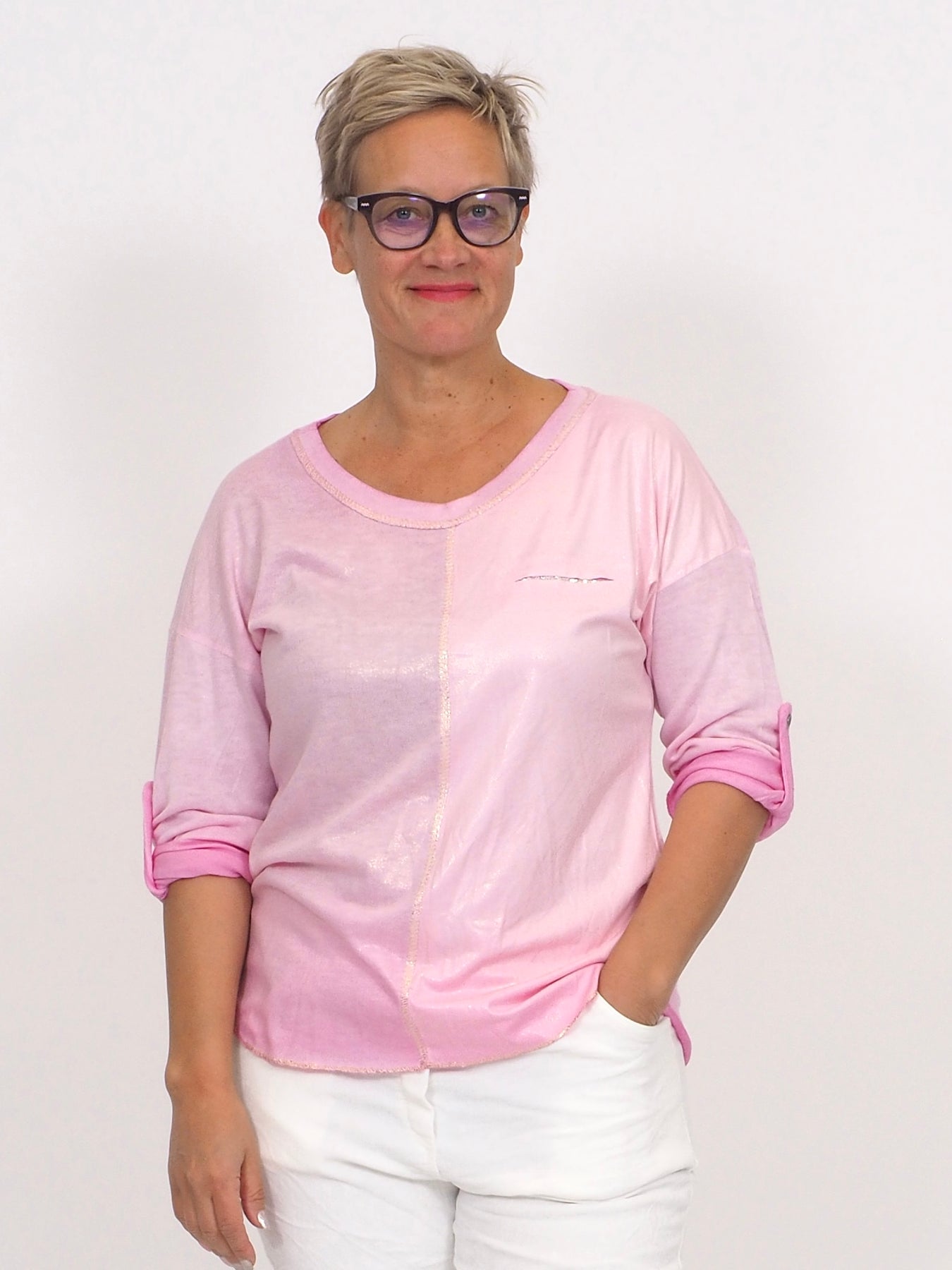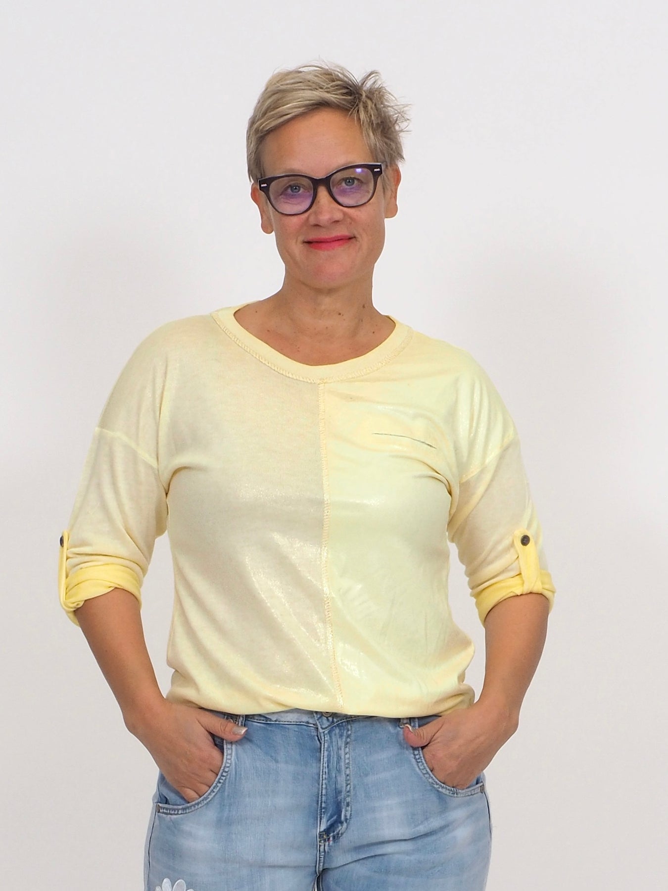 • Yhden koon joustava trikoopusero jossa hieman kullankimalletta