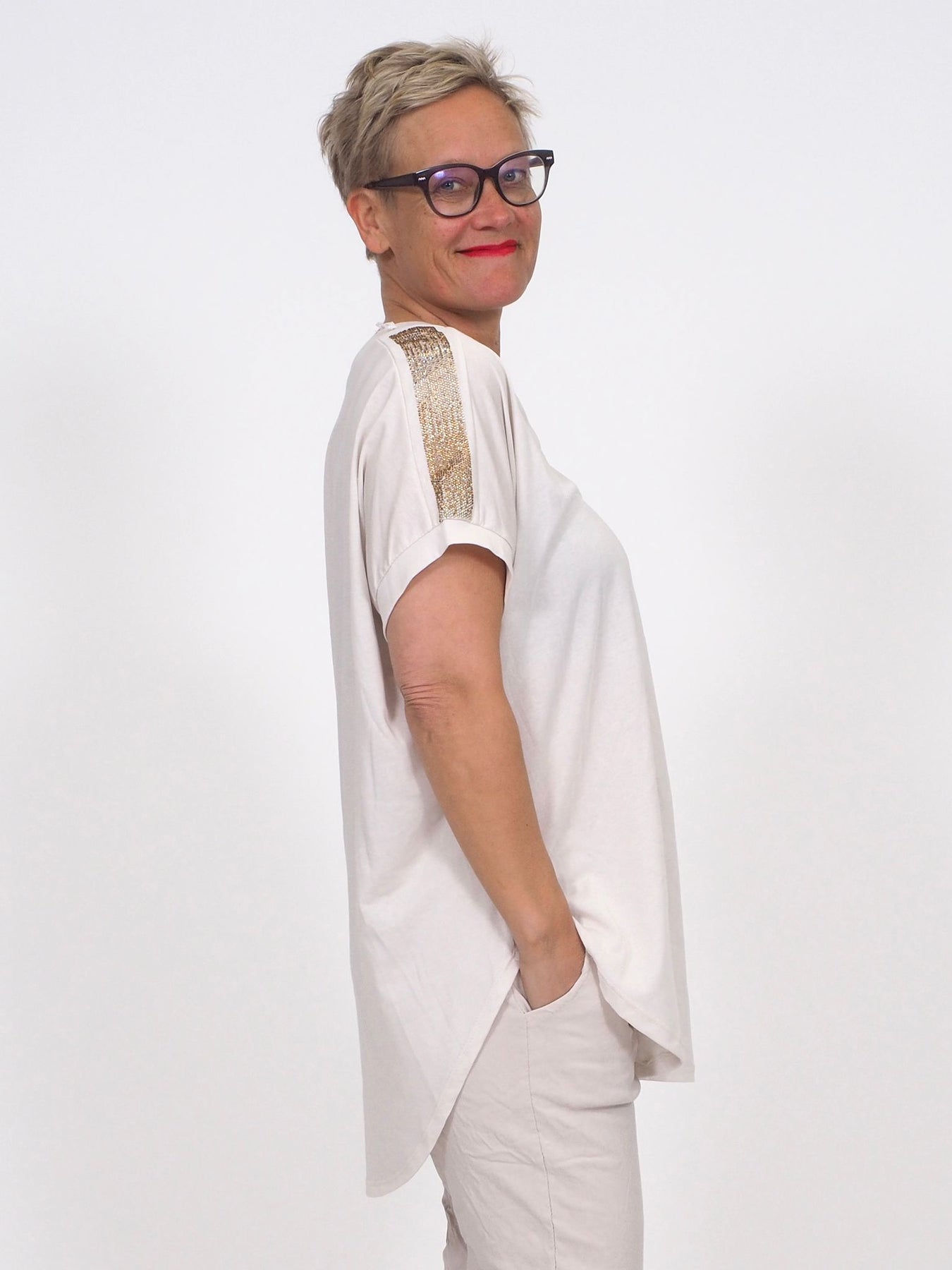 - Pidemmän mallinen pusero on v-aukkoinen, hihoissa kultainen koristeraita